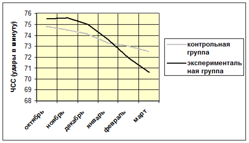 На графике отображена динамика изменения данного показателя в двух группах. В экспериментальной группе значение пробы Штанге возросло, так как постоянно производилась эта проба. График 3 Оценка текущего контроля. Частота сердечных сокращений