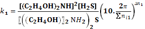 Коэффициент массоотдачи в газовой фазе: - коэффициент массоотдачи в газовой фазе, отнесенный к единице рабочей площади Находим: (А = 41700, m = 1, n = 0.5 – коэффициенты, Коэффициент массоотдачи в жидкой фазе равен: - коэффициент массоотдачи в жидкой фазе, отнесенный к единице рабочей площади Находим: (А = 240, m = 0,35, n = 0.58 – коэффициенты, Найдем константу фазового равновесия с поправкой на ионную силу раствора ДЭА:
