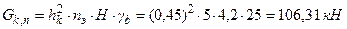 где hk – ширина колонны: hk = 450 мм (п. 1.4). 2.4.4. Продольные усилия в колонне 1-го этажа · Колонны здания работают в составе поперечной рамы каркаса, поэтому в них возникают продольные силы и изгибающие моменты. Последние обычно невелики, поэтому мы ограничимся только определением продольных усилий. · Наибольшая продольная сила в колонне возникает на уровне пола 1-го этажа (сечение «к » на рис. 2.2, а). · Колонна воспринимает со всех этажей нагрузку, действующую на её грузовой площади размером L ´l , а также нагрузку от собственного веса. · Нагрузка от собственного веса колонны 4 Нормативная нагрузка: