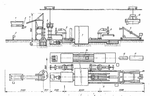 1 - приемный бункер для бетона; 2 - пульт управления; З, 4 - горизонтальные и наклонные ленточные конвейеры; 5 - автоматический захват для транспортирования форм и распалубки; 6 - поддон-тележка для накопления труб; 7 - камера тепловой обработки; 8 - манипулятор для транспортирования поддонов-тележек в камеру тепловой обработки; 9 - кантователь для перевода труб в горизонтальное положение; 10 - автоматический захват для переноса труб с кантователя на пост выдержки и готовой продукции; 11, 12 - стенды для испытания труб; 13 - устройство для перемещения поддонов-тележек; 14 - привод возврата поддонов-тележек из зоны кантования в зону распалубки. Для обеспечения необходимого режима тепловой обработки камера разделена на 4 зоны: предварительной выдержки, подъема температуры, изотермической выдержки, охлаждения. Изготовление труб диаметром 300...600 мм может производиться на опытно-промышленной линии, на которой организовано их производство способом радиального прессования (рис. 3). В качестве оборудования используют механизмы для подачи бетонной смеси, транспортеры поддонов-тележек и форм труб, стенды для испытания труб и пр. Толщина защитного слоя труб из бетона не менее 200 может быть уменьшена на 5 мм, но должна быть не менее 20 мм. В элементах, имеющих подрезку у опор, толщина защитного слоя нижней продольной арматуры на длине подрезки должна быть не больше толщины защитного слоя этой арматуры в пролете элемента. 3 Режим работы завода и основных цехов