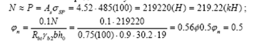 Конструктивно принимаем 4∅12 АТ–V RS=4,52 (см2 ). Расчет прочности панели по наклонному сечению: Q=25900 (H). Проверяем условие прочности по наклонной полосе между наклонными трещинами, полагая ϕВ1 =1 (при отсутствии расчетной поперечной арматуры):