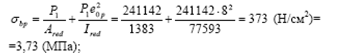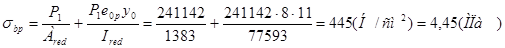 – эксцентриситет усилия Р1 относительно центра тяжести приведенного сечения: – напряжение в бетоне при обжатии: