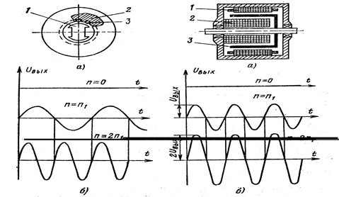 Первичная обмотка этого трансформатора может подключаться параллельно обмотке управления ωy (рис. 12-5,а ) или последовательно с ней (рис. 12-5,б ). В обоих случаях фаза выходного напряжения Uвых изменяется на 1800 при изменении полярности Uвых , т.е. схемы являются реверсивными. В схеме с параллельным соединением обмоток (рис. 1а ) постоянный ток не поступает в первичную обмотку выходного (обычно повышающего) трансформатора Тр . Путь постоянной составляющей тока преграждает конденсатор С . Напомним, что ёмкостное сопротивление Xc = 1/(ωC) , т.е. для постоянной составляющей (ω = 0) ёмкостное сопротивление стремится к бесконечности. Дроссель L (индуктивное сопротивление XL = ωL ) имеет очень малое сопротивление для сигнала постоянного тока, а для тока двойной частоты представляет большое сопротивление. Поэтому дроссель L препятствует прохождению тока двойной частоты через источник входного сигнала (например, датчик). Как правило, стремятся избежать обратного воздействия последующего элемента в системе автоматики на предыдущий (за исключением тех случаев, когда создаются обратные связи специально).