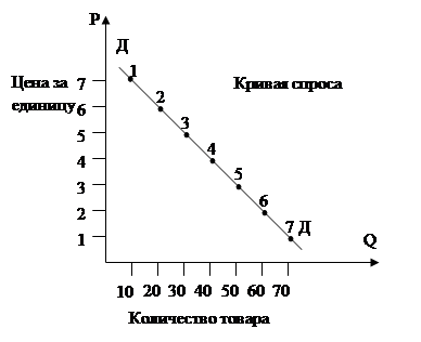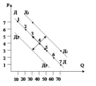Каждая точка выражает количество товара, которое потребитель решает купить по соответствующей цене. Соединив все точки получаем график спроса (кривую спроса) (ДД). Она имеет наклон вниз вправо, что говорит об отрицательной связи между двумя переменными – ценой и объемом спроса, т.о. спрос всегда связан с ценой. Снижение цены ведет к возрастанию V спроса, и наоборот: повышение цены поведения спроса. Следовательно, существует: отрицательная, или обратная связь между ценой и величиной спроса; называемой законом спроса – V (величина) спроса находится в обратной зависимости от измененной цены единицы товара. Обратная зависимость определяется 3 причинами: 1) снижение цен увеличивает число покупателей; 2) снижение цен расширяет покупательную способность потребителей; 3) насыщение рынка приводит к снижению полезности дополнительной единицы продукта. Закон убывающего (падающего) спроса гласит: если цена на товар растет (при прочих равных условиях), то спрос уменьшается. Факторы, влияющие на спрос. - ценовой фактор мы фактически уже рассмотрели. Это – цена на данный товар (обратная зависимость). Действие ценового фактора приводит к изменению V спроса (передвигая постоянной кривой спроса (гр. 21) точки 1, 2, 3, 4, 5, 6, 7). Среди ценовых факторов наибольшее воздействие на поведение покупателей оказывает следующие обстоятельства: а) цены взаимосвязанных товаров. Их называют еще сопряженные товары, т.е. товары, взаимозаменяющие или дополняющие друг друга в процессе потребления. б) доходы потребителей. в) вкусы потребителей. г) ожидания потребителей (потребительские ожидания). д) размеры рынка (V или величина предложения). е) число покупателей (конкуренция потребителей). ж) реклама. Проанализируем эти факторы: а) цены взаимосвязанных товаров. Они влияют на спрос по – разному. Влияние цен товаров - заменителей – взаимодополняющих товаров. Товары являются взаимозаменяемыми, если увеличение цены одного из них влечет за собой рост V спроса на другой товар при каждом значении цены. Товары являются взаимодополняемыми (комплектарными), если увеличение цены одного из них снижает объем спроса на другой. Комплектарные вещи – употребляемые в комплекте. б) доходы потребителей. Когда доход потребителя растет, увеличивается спрос на многие товары, особенно более дорогие, высококачественные блага. Спрос напрямую зависящий от изменения дохода называют нормальными товарами, или товарами высшей категории. Вместе с тем существуют и такие товары, потребление которых с ростом доходов уменьшается – называются благими (низшей категории), такими являются те, для которых существуют альтернативные товары более высокого качества или более удобные в потреблении. в) вкусы потребителей – важнейший фактор, определяющий объем спроса на любой товар. Предпочтения потребителей формируется под влиянием общества, обычаев, образования, рекламы. г) ожидания потребителей. Потребительские ожидания связаны: 1) с изменением цен на товары и услуги. 2) с изменением доходов населения. д) число покупателей. Чем больше на рынке потребителей, тем больше спрос, а следовательно, уменьшение числа потребителей означает сокращение объема спроса. е) размер рынка (размер предложения). Чем больше предлагается товара, тем меньше цена на него (сказывается конкуренция производителей) и, следовательно, те