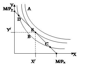 График иллюстрирует карту кривых безразличия, состоящую из четырех кривых: I, II, III, IV. Любая кривая безразличия, лежащая выше и правее другой, представляет более высокий уровень потребления полезности. Суммируя свойства кривых безразличия, следует указать следующие основные черты: 1) кривая безразличия, лежащая выше и правее другой кривой, представляет собой более предпочтительные наборы, причем между двумя любыми кривыми можно провести новую кривую безразличия. Это свойство является предпосылкой потребительского предпочтения о том, что покупатель знает свои потребности и способен их ранжировать. 2) Кривые безразличия никогда не пересекаются и не касаются друг друга. Пересечение кривых означает, что потребитель непоследователен в ранжировании своих потребностей. 3) Кривая безразличия всегда имеет «отрицательный» наклон, т.е. идет слева сверху и вправо вниз. Это значит, что покупатель имеет возможность компенсировать уменьшение потребления одного товара увеличением потребления другого. 4) Абсолютный наклон кривой безразличия уменьшается при движении по ней вправо вниз. Далее рассмотрим вопрос выбора в условиях бюджетного ограничения на примере двух товаров – Х и У, имеющих соответственно цены Рх и Ру . отсюда сумма будет равняться Рх Х + Ру У. Если бюджетное ограничение представить в виде уравнения прямой Рх Х + Ру У = М, то данную прямую можно назвать бюджетной линией. Бюджетная линия потребителя представляет собой совокупность всех комбинаций или набора товаров Х и Y, которые покупатель может приобрести при данных уровне дохода и ценах указанные на товары. График доступный потребительский ассортимент.