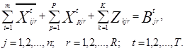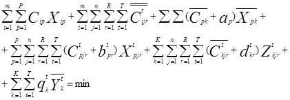 · объем и структура реализации нефтепродуктов в пунктах производства · объем и структура реализации нефтепродуктов на нефтебазах и в филиалах · закрепление нефтебаз за НПЗ · закрепление потребителей за нефтебазами и их филиалами. Математическая постановка сводится к линейной динамической, многоэтапной транспортной модели, учитывающей несколько видов нефтепродуктов. Все пункты производства нефтепродуктов составляют первый этап, пункты хранения их на нефтебазах – второй, в филиалах – третий. Все пункты – потребители нефтепродуктов – рассматриваются как четвертый этап. 2.2 Принятые обозначения Введем обозначения: i - номер пункта производства нефтепродуктов, i=1,2,…,m; k – номер пункта хранения (филиала), k=1,2,…,k; p - номер пункта хранения (нефтебазы), р=1,2,…,р; j – номер потребителя нефтепродуктов, j=1,2,…,n; r – номер нефтепродуктов, r=1,2,…,R; t – номер периода, t=1,2,…,T;