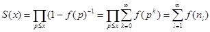 абсолютно сходится, и его сумма как сумма бесконечно убивающей геометрической прогрессии равна (1-f(р))-1. Кроме этого, в силу абсолютной сходимости, ряды можно перемножить. Перемножая конечное число таких рядов и используя то, что f(n) есть вполне мультипликативная функция, получим