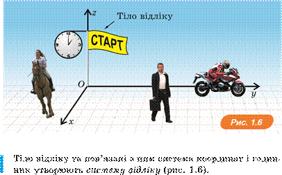, пов’язаної з тілом відліку. А оскільки рух тіла характеризується зміною положення тіла з часом, для опису руху потрібен також годинник