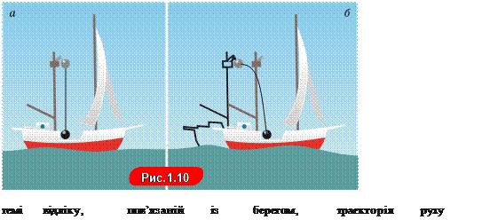 Приклад (із книги Ґалілея). Нехай з вершини щогли корабля, що пливе, на його палубу падає ядро. У системі відліку, пов’язаній із кораблем, траєкторія руху ядра — прямолінійний відрізок (рис. 1.10, а ). З точки ж зору спостерігача, який стоїть на березі, ядро мало початкову горизонтальну швидкість, що дорівнювала швидкості корабля. Тому в сис-
