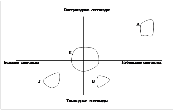 Фирме потребуется собрать информацию обо всех девяти сегментах рынка. Это должны быть сведения об объёмах продаж в денежном выражении, ожидаемых темпах роста сбыта, прогнозируемых размерах прибыли, интенсивности конкуренции, требованиям к маркетинговым каналам и.т.д. Наиболее выгодный сегмент должен обладать высоким уровнем текущего сбыта, высокими темпами роста, высокой нормой прибыли, слабой конкуренцией, и несложными требованиями к маркетинговыми каналам. Как правило, ни один из сегментов не отвечает в желаемой мере всем этим характеристикам, так что придётся идти на компромиссы. После того как фирма выявит объективно привлекательные сегменты, она должна задаться вопросом, какой из них наиболее полно соответствует её сильным деловым сторонам. Например, крайне привлекательным может оказаться военный рынок, но у фирмы, совсем нет опыта работы с ним. И, наоборот, у нее может быть большой опыт работы с потребительским рынком. Так что фирме следует выбирать сегмент, который не только привлекателен сам по себе, но и такой, для успешной работы в котором у неё есть необходимые деловые предпосылки. Решив, на каком сегменте выступать, фирма должна решить, как проникнуть в этот сегмент. Если сегмент уже устоялся, значить в нем есть конкуренция. Более того, конкуренты уже заняли в рамках сегмента свои «позиции». И прежде чем решить вопрос о собственном позиционировании, фирме необходимо определить позиции всех имеющихся конкурентов. Предположим, фирма узнаёт, что покупателей интересует в первую очередь два параметра снегоходов: размеры и скорость. Потенциальных клиентов и дилеров можно опросить, как воспринимают они с точки зрения этих параметров снегоходы конкурентов. Результаты опроса представлены на схеме позиционирования товара рис 2.3.