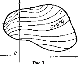 Для того чтобы пользоваться наглядными геометрическими представлениями, мы введем в рассмотрение координатную плоскость Р переменных t и х. При этом t как независимое переменное мы будем откладывать по оси абсцисс, а х как зависимое переменное - по оси ординат. Функция f, определяющая дифференциальное уравнение (2), может быть задана не для всех значений своих аргументов t и х, или, говоря геометрическим языком, не во всех точках плоскости Р, а лишь в точках некоторого множества Г плоскости Р (рис.1). Относительно множества Г мы в дальнейшем всегда будем предполагать, что оно является открытым. Это значит, что наряду с каждой точкой р в Г входит и некоторый круг положительного радиуса с центром в р. Относительно функции f будет предполагаться, что как она сама, так и ее частная производная являются непрерывными функциями пары переменных на всем множестве Г. Решение уравнения (2) будем геометрически изображать в плоскости Р в виде кривой с уравнением . Кривая эта в каждой точке имеет касательную и полностью проходит в открытом множестве Г; она называется интегральной кривой дифференциального уравнения (2).
