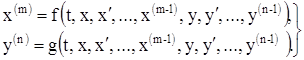 Так как в ряде физических применений независимым переменным, от которого зависят неизвестные искомые функции, является время, которое принято обозначать через t, то всюду в дальнейшем независимое переменное будет обозначаться через t. Неизвестные функции будут обозначаться через x, y, z и т. д. Производные функции по t будут, как правило, обозначаться так: , и т. д. В тех случаях, когда это неудобно или невозможно, мы будем указывать порядок производной верхним индексом в скобках; например, .