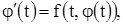 Здесь t - независимое переменное, x - его неизвестная функция, - ее производная, а F - заданная функция трех переменных. Функция F может быть задана не для всех значений ее аргументов; поэтому говорят об области B задания функции F. Здесь имеется в виду множество В точек координатного пространства трех переменных . Решением уравнения (1) называется такая функция независимого переменного t, определенная на некотором интервале (случаи не исключаются), что при подстановке ее вместо x в соотношение (1) мы получаем тождество на всем интервале . Интервал называется интервалом определения решения . Очевидно, что подстановка в соотношение (1) возможна лишь тогда, когда функция на всем интервале имеет первую производную (и, в частности, непрерывна). Для того чтобы подстановка в соотношение (1) была возможна, необходимо также, чтобы при произвольном значении переменного t из интервала точка с координатами принадлежала множеству В, на котором определена функция F.