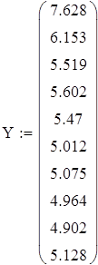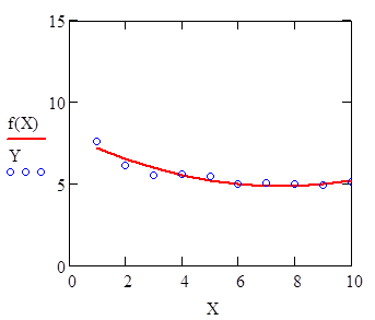 С помощью функции genfit – системы MathCadпровести нелинейную ре-гресссию общего вида для f(x)=ax+b/x; f1(x)=ax+bx+c; f3(x)=a Под нелинейной регрессией общего вида подразумевается нахождение вектора Р параметров произвольной функции F (x, u1, u2, ..., un), при котором обеспечивается минимальная среднеквадратичная погрешность приближения “облака” исходных точек. Для проведения нелинейной регрессии общего вида используется функция genfit (X, Y, S, F1) . Она возвращает вектор Р параметров функции F, дающий минимальную среднеквадратичную погрешность приближения функцией F(x, u1, u2, ..., un) исходных данных. F должен быть вектором с символьными элементами, причем они должны содержать аналитические выражения для исходной функции и ее производных по всем параметрам. Вектор S должен содержать начальные значения элементов вектора P, необходимые для решения системы нелинейных уравнений регрессии итерационным методом. При решении этой задачи возникают две проблемы. Прежде всего, надо вычислить значения производных по переменным а и b. Это может быть cделано с помощью символьных операций, что наглядно показывает пользу от таких операций. Вторая проблема связана с необходимостью применения функции genfit в ее стандартном виде. Поэтому пришлось заменить параметр а на u1, а параметр b на u2 и т. д.. Пример использования метода в среде Math C ad: І СПОСОБ (Для функции - f 1( x )= ax + bx + c ) 1) Вводим результаты измерений величин X и Y :