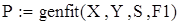 5) С помощью функции genfit(Х,Y, S ,F1) , найдем значения коэффициентов регрессии a, b, гдеX и Y - векторы экспериментальных данных, S - вектор с начальными приближениями коэффициентов регрессии, F1 - вектор F1(x,u)