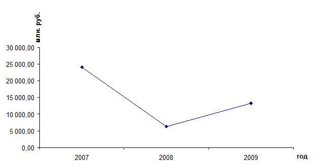 Рис.1. Выручка от продаж продукции, работ и услуг ОАО «Томскнефть» ВНК за 2007-2009гг. Изучив графики на рис.1, можно отметить, что в 2009 году выручка значительно снижается. В 2007г. выручка составляла 70 431,9 млн.руб., в 2008г. она составила 73 800,3 млн.руб., а в 2009г. Она снизилась до 63 089,8 млн.руб. Такой спад связан прежде всего со снижением себестоимости проданных товаров, продукции, работ, услуг. Однако следует отметить, что рентабельность продукции возрасла, также как и чистая прибыль (за 2007г - 24 060,6 за 2008г. – 6 231,3, за 2009г. – 13 231,9) , что можно заметить на графике приведенном на рис.2.