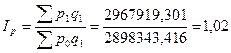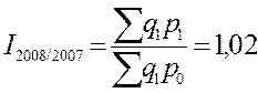 Определим индекс цен: На основе данных таблицы 5 можно рассчитать индекс стоимости и индекс физического объема продукции, весами в которых будут являться цены 2007 года. Индекс физического объема продукции будет исчисляться, как Индекс стоимости: