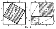 ДОКАЗАТЕЛЬСТВА ТЕОРЕМЫ ПИФАГОРА Доказательства, основанные на использовании понятия равновеликости фигур. При этом можно рассмотреть доказательства, в которых квадрат, построенный на гипотенузе данного прямоугольного треугольника «складывается» из таких же фигур, что и квадраты, построенные на катетах. Можно рассматривать и такие доказательства, в которых применяется перестановка слагаемых фигур и учитывается ряд новых идей. На рис. 2 изображено два равных квадрата. Длина сторон каждого квадрата равна a + b. Каждый из квадратов разбит на части, состоящие из квадратов и прямоугольных треугольников. Ясно, что если от площади квадрата отнять учетверенную площадь прямоугольного треугольника с катетами a, b, то останутся равные площади, т. е. c2 = a2 + b2 . Впрочем, древние индусы, которым принадлежит это рассуждение, обычно не записывали его, а