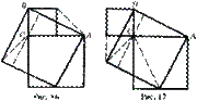 Поясним этот метод на примере. На рис. к обычной пифагоровой фигуре приставлены сверху и снизу треугольники 2 и 3, равные исходному треугольнику 1. Прямая DG обязательно пройдет через C. Заметим теперь (далее мы это докажем), что шестиугольники DABGFE и CAJKHB равновелики. Если мы от первого из них отнимем треугольники 1 и 2, то останутся квадраты, построенные на катетах, а если от второго шестиугольника отнимем равные треугольники 1 и 3, то останется квадрат,построенный на гипотенузе. Отсюда вытекает, что квадрат, построенный на гипотенузе, равновелик сумме квадратов,построенных на катетах. Остается доказать, что наши шестиугольники равновелики. Заметим, что прямая DG делит верхний шестиугольник на равновеликие части; то же можно сказать о прямой CK и нижнем шестиугольнике. Повернем четырехугольник DABG, составляющий половину шестиугольника DABGFE, вокруг точки А по часовой стрелке на угол 90; тогда он совпадет с четырехугольником CAJK, составляющим половину шестиугольника CAJKHB. Поэтому шестиугольники DABGFE и CAJKHB равновелики. Другое доказательство методом вычитания. Познакомимся с другим доказательством методом вычитания. Знакомый нам чертеж теоремы Пифагора заключим в прямоугольную рамку, направления сторон которой совпадают с направлениями катетов треугольника. Продолжим некоторые из отрезков фигуры так, как указано на рисунке, при этом прямоугольник распадается на несколько треугольников, прямоугольников и квадратов. Выбросим из прямоугольника сначала несколько частей так чтобы остался лишь квадрат, построенный на гипотенузе. Эти части следующие: