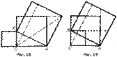 Приравнивая эти выражения, получаем теорему Пифагора. Существует много доказательств теоремы Пифагора, проведенных как каждым из описанных методов, так и с помощью сочетания различных методов. Завершая обзор примеров различных доказательств, приведем еще рисунки, иллюстрирующие восемь способов, на которые имеются ссылки в «Началах» Евклида (рис. 16 – 23). На этих рисунках Пифагорова фигура изображена сплошной линией, а дополнительные построения – пунктирной.