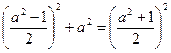 Наприклад, якщо а = 3, то сторони трикутника дорівнюють 3, 4, 5; якщо а = 5, то сторони дорівнюють 5, 12, 13; якщо а = 7, то сторони будуть 7, 24, 25 тощо. Прямокутний трикутник піфагорійці вважали найкращою і найдосконалішою фігурою. Одним із способів побудови такого трикутника був поділ правильного трикутника пополам. Прямокутні трикутники, довжини сторін яких — цілі числа, утворюють окремий клас, для якого справджується теорема, названа ім'ям Піфагора, хоч вона була відома задовго до нього вавілонянам. За теоремою Піфагора сума площ квадратів, побудованих на катетах прямокутного трикутника, дорівнює площі квадрата, побудованого на гіпотенузі (дивись малюнок).