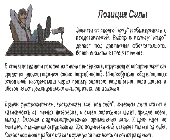 Рис. 3.1. Позиция силы в сфере управления В какой-то момент человек начинает осознавать, что эгоцентризм («Я есть центр вселенной, и все вокруг меня вертится для моего удовольствия») не приветствуется обществом. Это заставляет его старательно скрывать от других людей свою зависимость, подавлять на людях проявления эгоцентризма. Он все еще на Позиции Силы, все еще ориентируется на себя и свое «хочу», но уже не такой, как явно выраженные эгоцентрики. Следует отметить, что полное и подробное описание Позиции – отдельная задача, необходимость решения которой появляется по мере формирования у управленцев потребности в новых знаниях. Кроме того, последовательность духовного развития приведена и применима к человеку как таковому. Каждый же конкретный человек рождается в семье, где родители уже занимают какие-то Позиции. Поэтому его духовное развитие на начальном этапе, как правило, есть результат воспитания по образу и подобию своих родителей. Реже, уже во взрослом состоянии – это осознание, которому предшествует какое-то событие или целенаправленное воздействие духовного плана. Но даже в этом случае после такого осознания следует долгий период духовного роста. В итоге получается, что Позиция – устойчивое образование, но не врожденное, потому что под воздействием обстоятельств и собственных усилий Позиция человека может изменяться. Постепенно человек начинает понимать, что действовать силой среди себе подобных неправильно. Когда интересы пересекаются, гораздо правильнее договариваться о том, как в конкретной ситуации поступать всем сторонам, а не руководствоваться только своим «хочу» (а оно ведь никуда не девается). С этого момента человек переходит на Позицию Логики, логики общественного сосуществования. Теперь он способен сознательно сделать выбор между «хочу» и «надо». Теперь у него появляется 1 степень свободы. Фактически, он перестает зависеть от своего «хочу» и становится социоцентриком. Это означает, что договоренность, закон, логика общественного сосуществования для него более важны, чем собственное «хочу». Такой человек отчетливо осознает, что если он со своей стороны нарушит эту логику, ему же потом хуже будет. Более того, теперь он заинтересован, чтобы эту логику не нарушали и другие. Если с таким человеком договориться о чем-либо, то можно быть уверенным, что он приложит усилия к тому, чтобы придерживаться договоренности. В этом плане о таком человеке можно сказать, что он ответственен и надежен в широком смысле этого слова. И именно это является необходимым условием того, чтобы человек может не только отвечать за порученное дело, но и требовать такой же ответственности от своих подчиненных. На рис. 8 показаны особенности человека, занимающего Позицию Логики , применительно к сфере управления. Из сказанного следует, что о способности к управлению можно говорить только в том случае, если человек имеет, как минимум, 1 степень свободы.