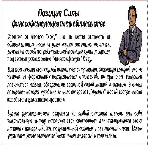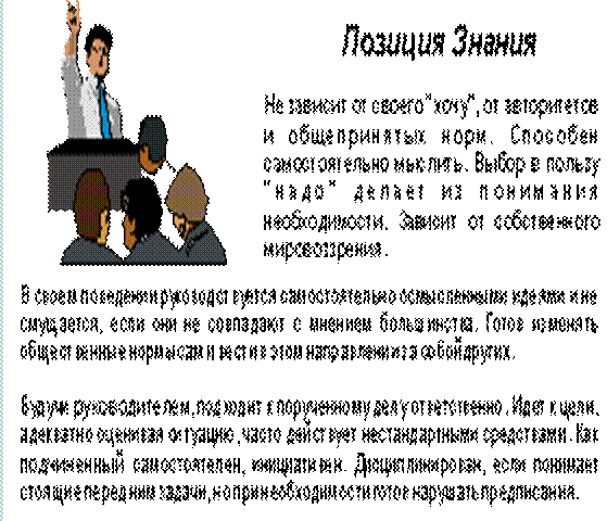 Рис. 9 Позиция знания в сфере управления Существует еще одна категория людей, которые зависят от своего «хочу» и в то же время обладают самостоятельным мышлением, поскольку стремятся быть не такими, как все. Они находятся на Позиции Силы, и такое сочетание делает их «философами от потребления». Условно они обозначаются как люди с –1 степенью свободы. Несомненно, это – эгоцентрики, но такие, которые в силу ума способны вести за собой людей. Чаще всего именно из таких людей получаются негативные лидеры. На рис. 10 показаны особенности сочетания потребительской жизненной позиции и самостоятельности мышления человека применительно к сфере управления.