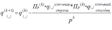 Первый столбец - коэффициенты в целевой функции при базисных переменных. Второй столбец - базисные переменные. Третий столбец - свободные члены (hi00). Самая верхняя строка - коэффициенты при целевой функции. Вторая верхняя строка - сами переменные, входящие в целевую функцию и в систему ограничений. Основное поле симплекс метода - система коэффициентов из уравнения. Последняя строка - служит для того, чтобы ответить на вопрос: «оптимален план или нет». Индексная строка позволяет нам судить об оптимальности плана: При отыскании Fmin в индексной строке должны быть отрицательные и нулевые оценки. При отыскании Fmax в индексной строке должны быть нулевые и положительные оценки. Переход ко второй итерации: Для этого отыскиваем ключевой (главный) столбец и ключевую (главную) строку. Ключевым столбцом является тот в котором находится наибольший положительный элемент индексной строки при отыскании Fmin или наименьший отрицательный элемент при отыскании Fmax. Ключевой строкой называется та, в которой содержится наименьшее положительное частное от деления элементов столбца H на соответствующие элементы ключевого столбца. На пересечении строки и столбца находится разрешающий элемент. На этом этапе осуществляется к переходу к последующим итерациям. Переход к итерациям: Выводится базис ключевой строки, уступая место переменной из ключевого столбца со своим коэффициентом. Заполняется строка вновь введенного базиса путем деления соответствующих элементов выделенной строки предыдущей итерации на разрешающий элемент. Если в главной строке содержится нулевой элемент, то столбец, в котором находиться этот элемент переноситься в последующую итерацию без изменения. Если в главном столбце имеется нулевой элемент, то строка, в которой он находиться переноситься без изменения в последующую итерацию. Остальные элементы переносятся по формуле:
