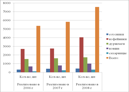 Динамика ассортимента металлической посуды, для приготовления холодных блюд и сервировки стола, реализованной в магазине ООО «Пионер» по видам за 2008-2010 годы представлена на рис. 6.