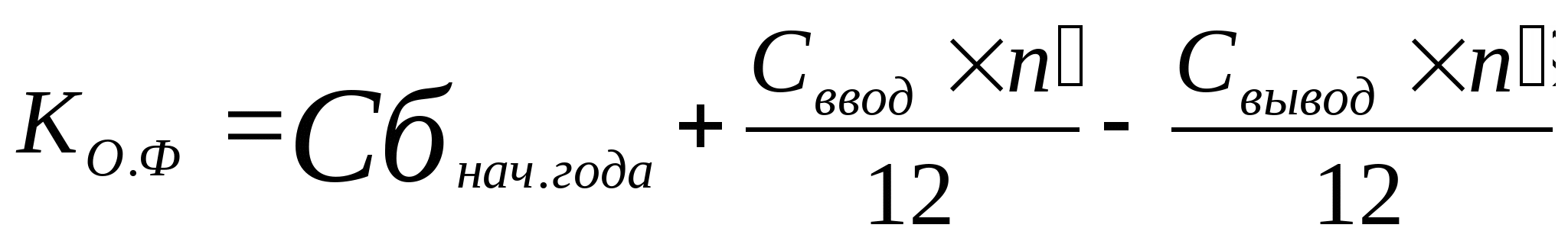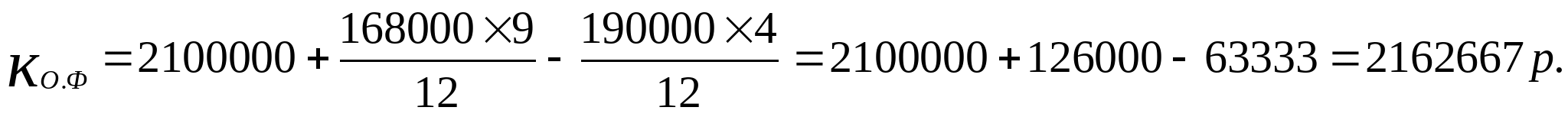 производственный и хозяйственный инвентарь: 13 июня было вновь введено средств на сумму 36000 (Сввод), с 1 июля они числятся на балансе т.е. n'=6 мес, 12 сентября было выведено средств на сумму 20000 (Свывод) и с 1 октября они не числятся на балансе т.е. n''=3 мес., отсюда: