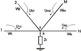 Рисунок 1.3 Электрическая схема трансформатора:1 - первичная обмотка; 2 – магнитопровод; 3 – вторичная обмотка. В качестве коммутационных аппаратов на подстанциях используют выключатели и разъединители. Выключатели служат для отключения и включения цепи в любых режимах: длительная нагрузка, перегрузка, короткое замыкание, холостой ход, несинхронная работа. Разъединители предназначены для отключения и включения цепи без тока. Разъединитель для обеспечения безопасности имеет между контактами в отключенном положении изоляционный промежуток. 2. Расчет напряжения на изоляции силового трансформатора при заданной волне перенапряжения Расчет производим по правилу эквивалентной волны. Данный метод заключается в следующем: пусть в узле xсходятся n линий, по которым в узел х набегают волны перенапряжения Umx . К узлу х подключено сопротивление нагрузки Zх . Каждая линия обладает собственным волновым сопротивлением Wm (Рисунок 2.1.).