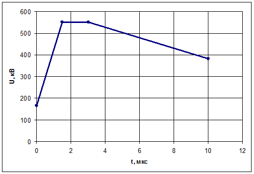 Рисунок 3.1 Кривая допустимых импульсных перенапряжений для внутренней изоляции трансформатора. Расчет производится при помощи компьютерной программы, в которой используются те же уравнения, составленные ранее для каждого узла. Падающая волна представляется дискретными значениями для каждого расчетного шага: