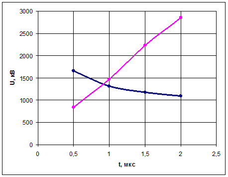 В Таблице 3.2 * помечены исходные данные, которые меняются в процессе расчета КОП. Для определения КОП необходимо добиться касания кривой перенапряжения на трансформаторе U2 с кривой импульсной прочности изоляции трансформатора (изменяя значения Uп.оп ). Таким образом будет найдена первая точка КОП - сочетание опасной амплитуды падающей волны Uп.оп и опасной длительности фронта волны τФ . Далее нужно изменить τФ и, изменяя амплитуду падающей волны, вновь добиться касания U2 кривой допустимых импульсных перенапряжений для внутренней изоляции трансформатора. Таким образом, определяем амплитуду опасного импульса напряжения Uопас и величину фронта этого импульса τф . Эти значения заносим в Таблицу 3.2. По данным Таблицы 3.2 построим кривую опасных параметров Рисунок 3.2. На эту же координатную плоскость нанесем вольт-секундную характеристику линейной изоляции, которую можно рассчитать по формуле: