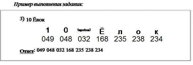 Коды больших английских букв: 065 (A) – 090 (Z) Коды строчных английских букв: 097 (a) – 122 (z) Коды больших русских букв: 168 (Ё), 192(А) – 223 (Я) Коды строчных русских букв: 184 (ѐ), 224 (а) – 255 (я) Коды арабских цифр: 048 (0) – 057 (9) Код пробела – 032 В задании следует обращать внимание на регистр букв (большие / строчные).