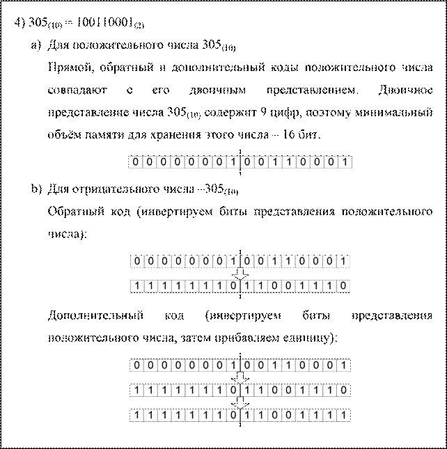 4. Запишите прямой, обратный и дополнительный код числа, интерпретируя его как восьмибитовое целое без знака и со знаком. Прямой, обратный и дополнительный коды положительного числа совпадают с его двоичным представлением. А для отрицательного числа нужно воспользоваться соответствующим алгоритмом (см. в методичке). Целые числа хранятся в памяти ЭВМ в ячейках размером 8, 16, 32 или 64 бита, в зависимости от величины данного числа. Если для представления числа вашего варианта не хватает восьми бит, следует использовать 16 (или больше, если не хватает и этого). При выполнении задания можно пользоваться калькулятором.