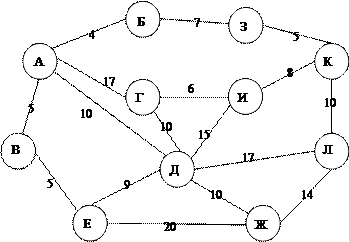 Рисунок 2 Кратчайшая связывающая сеть Назовем все пункты, указанные на рис.1, вершинами сети, а линию, соединяющую две соседние вершины, - звеном. Кратчайшей связывающей сетью называется незамкнутая сеть, связывающая две и более вершины с минимальной суммарной длиной всех соединяющих их звеньев. На схеме (рис.1)находится наименьшее звено. В данном случае это звено А-Б = 4 км . Затем рассматриваются все звенья, связанные одной из своих вершин с выбранным звеном, т.е. звенья: А-В = 5км , Б-З = 7 км . Из них выбирается звено с наименьшим расстоянием (А - В = 5 км ). Далее рассматриваются все звенья, связанные с вершинами полученной ломаной линии Б-А-В, из них выбирается наименьшее, и так до тех пор, пока не будут выбраны все вершины сети. При этом нельзя выбирать звено, соединяющее две ранее включенные в сеть вершины. На рис. 2 представлена кратчайшая связывающая сеть. Этап 2 Набор пунктов в маршруты По каждой ветви сети (рис.2), начиная с той, которая имеет наибольшее количество звеньев, производится группировка пунктов для включения в маршрут. В каждый маршрут группируются пункты с учетом количества ввозимого и вывозимого грузов (табл. 1) и вместимости единицы подвижного состава . Если все пункты данной ветви не могут быть включены в один маршрут, то ближайшие к другой ветви пункты группируются вместе с пунктами этой ветви. Необходимо учитывать, что максимальная вместимость автомобиля равна 2т. (2,5*0,8) Исходя из этого, пункты, указанные на рис. 2, группируются следующим образом. (табл. 2) Таблица 2