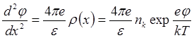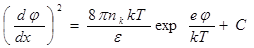 Так как мы рассматриваем обогащенный слой в электронном полупроводнике, то φ < 0 и увеличивается по абсолютной величине с увеличением х, а, следовательно, нашей задаче соответствует знак минус. Интегрируя это уравнение еще раз по х в пределах от 0 до х, находим распределение потенциала в виде где а