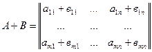 Матрица, у которой строки являются столбцами заданной матрицы, называется транспонированной по отношению к заданной и обозначается АТ . Так по отношению к заданной матрице А=|| aij ||, если поменять в ней местами строки и столбцы, транспонированной будет матрица АТ =|| aij || называется неособенной или невырожденной, если ее определитель DetA не равен нулю. При DetA=0 матрица называется особенной (вырожденной). Обратной матрицей А-1 по отношению к данной квадратной матрице А называется матрица, удовлетворяющая соотношению АА-1 =Е. Сложение или вычитание возможно только для прямоугольных матриц одного порядка, при этом сумма матриц порядка m*n дает матрицу того же порядка. Элементы суммарной матрицы равны сумме соответствующих элементов складывающих матриц, т.е.