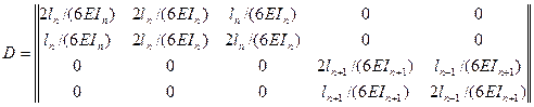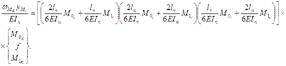 В большинстве случаев при составлении матриц {Mi } и {Mk } равные моменты на стыках сопряженных участков можно записать один раз, но при этом матрицу податливости нужно как бы сжать на один столбец и одну строку, сложив положившиеся элементы матрицы. Например, при суммировании результатов перемножения на участках n и n+1(рис.1, а, б) можно вместо матрицы податливости вида