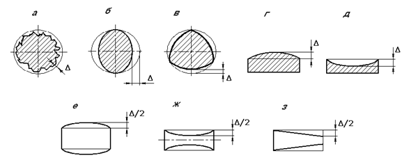 Отклонения формы и расположения поверхностейОтклонения поверхностей определяются не только волнистостью и шероховатостью, но и отклонениями формы и взаимного расположения поверхностей. Различают номинальную поверхность, форма которой задана чертежом или другой технической документацией, и реальную поверхность, ограничивающую деталь и отделяющую ее от окружающей среды. Подобно определяются номинальный и реальный профили – линии пересечения соответствующих поверхностей с плоскостью или заданной поверхностью. В основу нормирования отклонений формы и расположения поверхностей положен принцип прилегающих поверхностей (плоскость, цилиндр) или прилегающих профилей (прямая, окружность). Под прилегающей поверхностью (профилем) понимается поверхность (профиль), соприкасающаяся с реальной поверхностью (профилем) вне материала детали и расположенная так, чтобы расстояние Δ от ее наиболее удаленной точки до прилегающей поверхности (профиля) было минимальным (рис. 3). Отклонение формы оценивается наибольшим расстоянием Δ от точек реальной поверхности (профиля) до прилегающей поверхности (профиля) по нормали к прилегающей поверхности (профилю). Частными видами некруглости (рис. 3, а) являются овальность (рис. 3, б) и огранка (рис. 3, в); неплоскостности и непрямолинейности – выпуклость (рис. 3. г) и вогнутость (рис. 3, д); нецилиндричности поверхности – бочкообразность (рис. 3, е), седлообразность (рис. 3, ж) и конусообразность (рис. 3, з). В отклонение формы включается и волнистость.