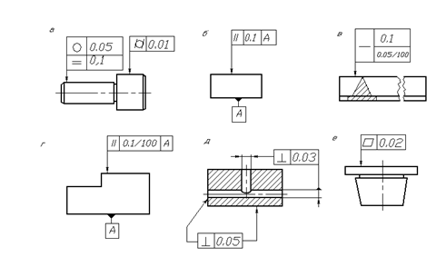 ![]() Рис. 4 Примеры обозначения на чертежах отклонений формы и расположения поверхностей приведены на рис. 5. Если допуск относится к ограниченному участку длины или поверхности в любом месте, то размеры нормируемого участка в миллиметрах указывают после числового значения допуска через разделительную наклонную линию (рис. 5, г). Допуск по всему элементу и одновременно допуск на определенном нормируемом участке указывают в объединенной рамке допуска (рис. 5, в).