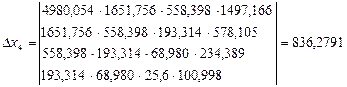 Параметр S розраховується за формулою S = x + x 2 + x 3 + x 0 - y (4.1) Таким чином, на основі проведених розрахунків нами отримана слідуюча система нормальних рівнянь 10 d+25,6 c+68,980b+193,314a-101=0, 25 d+68,980c+193,314b+558,398a-234,389=0, 68,980d+193,314c+558,398b+1651,756a-578,105=0 , (4.2) 193,314d+558,398c+1651,756b+4980,054a-1496,166=0, або 4980,054a+1651,756b +558,398c +193,314d -1496,166=0, 1651,756a+558,398b +193,314c +68,980d-578,105=0, 578,105a+100 ,998 b+68,980c+25,6d-234,389=0 , (4.3)193,314a+68,980b+25,6c+10d-101=0 5. Рішення системи лінійних рівнянь способом Крамера Нехай, маємо систему лінійних рівнянь a11 x1 + a12 x2 +…+ am xn = b1 , a21 x1 +a22 x2 +…+a2n xn =b2, (5.1) ……………………….. an1 x1 +an2 x2 +…+ann xn =bn . Для того, щоб із цієї системи визначити невідомі хі , складемо із коефіцієнтів при невідомих визначних Δ, який називається визначником системи рівнянь (5.1)