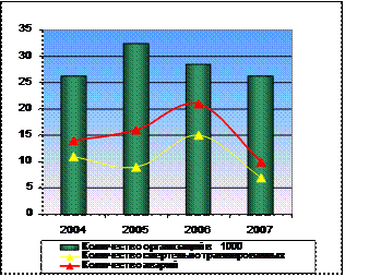 Рис. 9 Динамика травматизма со смертельным исходом и аварийности в зарегистрированных организациях использующих оборудование по давлением. В связи с реорганизации 2004 г. Ростехнадзора (произошло увеличение контролируемых объектов), 2005 г. количество аварий соответственно возросло. В 2007 году при эксплуатации оборудования на промышленных предприятиях, работающего под давлением, произошло 3 аварии и 7 несчастных случаев со смертельным исходом, что на 8 случаев меньше по сравнению с предыдущим годом. К основным нарушениям требований относится несоблюдение требований к эксплуатации опасных производственных объектов, установленных ст. 9 ФЗ «О промышленной безопасности опасных производственных объектов», а именно не обеспечено функционирование необходимых приборов и систем контроля, некачественно осуществляется производственный контроль. Анализ результатов контрольной и надзорной деятельности, уровень аварийности и травматизма позволяет оценить состояние промышленной безопасности опасных производственных объектов, на которых используется оборудование, работающее под давлением, как удовлетворительное. Если в технологическом процессе применяют горючие вещества и существует возможность их контакта с воздухом, то опасность пожара и взрыва может возникнуть как внутри аппаратуры, так и вне ее, в помещении и на открытых площадках. Так, большую опасность представляют аппараты, емкости и резервуары с горючими жидкостями, так как они не бывают заполнены до предела и в пространстве над уровнем жидкости образуется паровоздушная взрывоопасная смесь. Опасны в пожарном отношении малярные участки и цехи предприятий, где в качестве растворителей используют легковоспламеняющиеся жидкости. Заключение Результаты исследования статистической информации о динамике аварийности на взрывопожароопасных промышленных объектах позволили сформулировать следующие выводы: 1. Официальная статистика численности пострадавших за девятилетний период на производстве указывает на тенденцию снижения количества травм и гибели работников предприятий, но наблюдается увеличение масштабов аварий их последствий. 2. Рассмотренная динамика аварийности за шесть лет на объектах нефтегазодобычи выявило, что основные аварии представлены открытыми фонтанами и выбросами на нефтяных и газовых скважинах. Количество взрывов и пожаров в 2007 г. возросло в 3,5 раза по сравнению с 2006 г. В последние четыре года наблюдается устойчивая тенденция повышения количество падения буровых вышек и их частей, что связано с износом технологического оборудования. 3. На объектах магистрального газопровода наблюдается тенденция к снижению уровня аварийности в рассматриваемый период и отмечается цикличность скачков аварий, что по видимому связано с человеческим фактором. 4. Основным травмирующим фактором за последнее десятилетие для нефтехимической промышленности является термическое воздействие, однако число погибших в 2007 г. сократилось по сравнению с 2005 г. в 5 раз. Результатом таких изменений могут быть более жесткий контроль над объектами химической, нефтехимической, нефтегазоперерабатывающей промышленности. 5. Травматизм на объектах энергетики имеет устойчивую динамику снижения и за девять лет сократился в три раза. 6. Количество аварий и смертельно травмирован