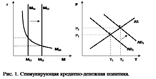 занятость. Какие меры могут обеспечить достижение этой цели? Во-первых, уменьшение учетной ставки процента, что должно убедить коммерческие банки увеличить займы у Центрального банка и тем самым увеличить собственные резервы. Во-вторых, Центральный банк осуществляет покупку государственных ценных бумаг на открытом рынке, оплачивая их увеличением резервов коммерческих банков. В-третьих, центральный банк уменьшает норму резервных требований, что переводит обязательные резервы в избыточные и увеличивает мультипликатор денежного предложения. Политика «дорогих» денег (см.рис.2) имеет своей целью ограничение денежного предложения, с тем, чтобы сократить совокупные расходы и снизить темпы инфляции. Она включает следующие мероприятия[3] : 1) Повышение учетной ставки процента, что выступает отрицательным стимулом для заимствований коммерческих банков у центрального банка; 2) Продажа центральным банком государственных ценных бумаг на открытом рынке; 3)