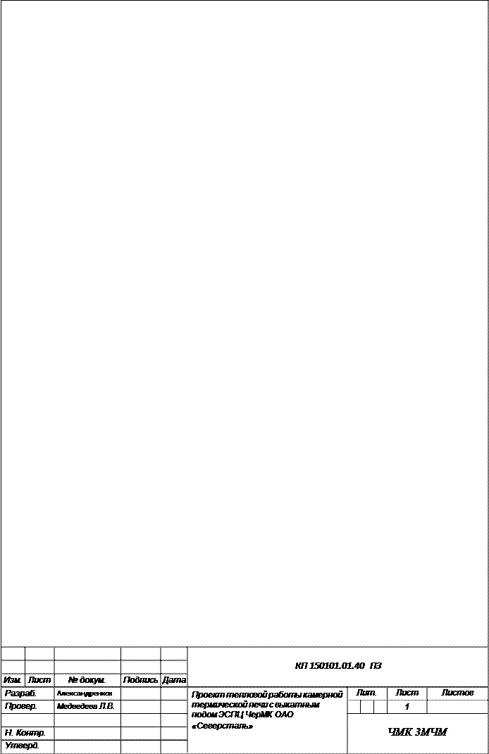 Специальность 150101 «Металлургия черных металлов» Проект тепловой работы камерной термической печи с выкатным подом ЭСПЦ ЧерМК ОАО « Cеверсталь» КП 150101.01.40 ПЗ Руководитель работы Медведева Л.В., преподаватель спец. дисциплин Работу выполнил Александренков И.С., студент группы 3-МЧМ