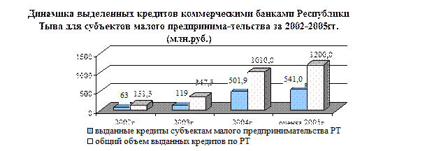 Менее половины кредитного портфеля имеют ОАО АКБ «Связь-банк» (46%), ОАО коммерческий банк «СибОВК» (45), Кызылское ОСБ № 8591 Сбербанка России (30) и Тувинский региональный филиал ОАО За январь-сентябрь 2005 года ОАО «Россельхозбанк», ОАО АБ «Народный банк РТ», ТРФ АКБ «Связь-банк», ОАО Банк «Тувакредит», ТФ ОАО АКБ «Росбанк», ТРФ КБ «Сибирское ОВК» и Кызылским ОСБ № 8591 Сбербанка России предпринимателям предоставлены кредиты на сумму 301,3 млн. рублей, темп роста составил 74,1%, заключено 337 договоров.