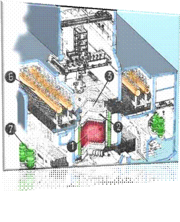 Вода под давлением 70 атмосфер главными циркуляционными насосами (3) ГЦН подается по трубопроводам (2) в нижнюю часть реактора(1), откуда по каналам продавливается в верхнюю часть реактора, омывая сборки с ТВЭЛами. В ТВЭлах под воздействием нейтронов идет цепная ядерная реакция с выделением большого количества тепла. Вода нагревается до температуры 248 градусов и вскипает. Смесь, состоящая из 14% пара и 86% воды поступает по трубопроводам (3) в барабаны сепараторы (2), где происходит отделение пара от воды. Пар по трубопроводу (4) подается в турбину.