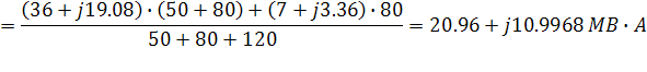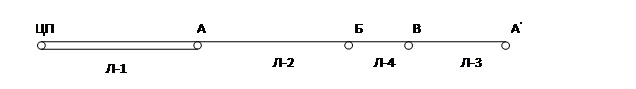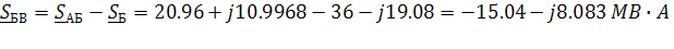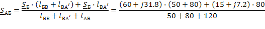 Для определения потокораспределения в кольце А-Б-В приближённо принимаем равенство напряжений в точках А и Б; А и В. Выполняем расчёт потокораспределения относительно этих точек питания в соответствующих линиях с двухсторонним питанием. Разомкнём кольцевую сеть в точке А.