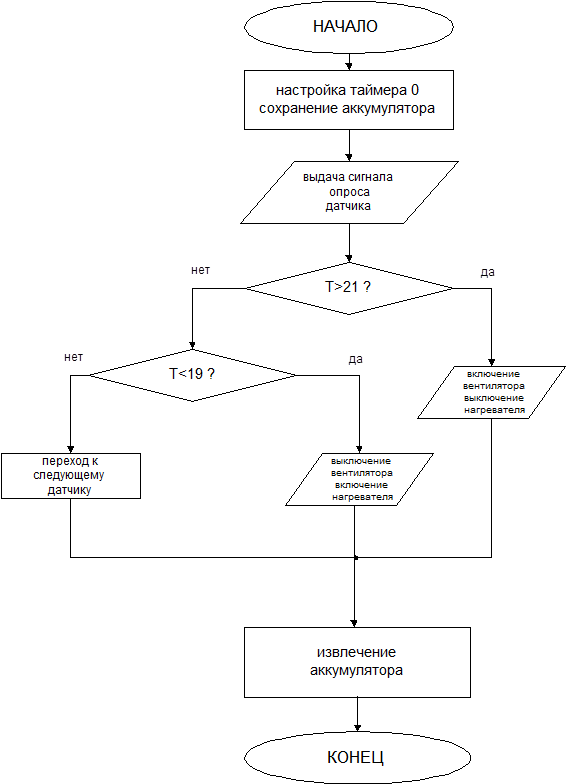 Министерство образования Российской Федерации УРАЛЬСКИЙ ГОСУДАРСТВЕННЫЙ ТЕХНИЧЕСКИЙ УНИВЕРСИТЕТ КАФЕДРА РАДИОЭЛЕКТРОНИКИ ИНФОРМАЦИОННЫХ СИСТЕМ Оценка работы_________ Члены комиссии________ ТЕРМОСТАТКурсовой проект Пояснительная записка Руководитель: Добряк В.А. Студент: Подкорытов А.П. Группа Р-406Д Екатеринбург 2006 Содержание Введение Разработка схемы устройства Принцип работы термостата Программное обеспечение Заключение Библиография Приложение 1. Схема электрическая принципиальная Приложение 2. Блок схема программы Приложение 3. Текст программы на языке ассемблера Введение В настоящее время в микропроцессорной технике выделился самостоятельный класс интегральных схем – микроконтроллеры, которые предназначены для встраивания в приборы различного назначения. Использование микроконтроллеров в различных изделиях не только приводит к улучшению всех показателей (стоимость, надежность, потребляемая мощность, габариты) и позволяет многократно сократить сроки разработки и отодвинуть сроки морального старения изделий, но и придаёт им принципиально новые потребительские качества: расширенные функциональные возможности, модифицируемость, адаптивность и т.д. Разработка схемы устройства Термостат выполнен на однокристальном микроконтроллере Intel 8051. В качестве многоканального АЦП был выбран 8ми канальный АЦП К572ПВ4. На входы Р0.0-Р0.7 микроконтроллера поступает код выбранного температурного датчика. Выбор датчика осуществляет АЦП, используя сигналы Р2.0-Р2.2. С выхода Р2.3 на вход АЦП поступают синхросигналы, необходимые для выбора датчика и начала преобразования. Порты Р2.4 и Р2.5 используются для управления реле, через которые подключены исполнительные элементы (вентилятор и нагреватель). Тактовая частота микроконтроллера задается кварцевым резонатором, частота которого равна 12МГц. АЦП включен по стандартной схеме[5]. Схема устройства приведена в приложении 1. Принцип работы термостата Код от температурного датчика поступает на один из портов микроконтроллера (Р0). Поступивший код анализируется микроконтроллером на предмет соответствия температуры заданным рамкам (19о С-21о С). Если температура находится в заданных пределах, то анализируется код следующего датчика (всего 8 датчиков). Датчики опрашиваются с периодом 320 мкс (если температура всех датчиков находится в заданных пределах). Выбор датчика осуществляется при помощи сигналов Р2.0-Р2.2. Если температура какого-либо датчика окажется за границами заданной области, то включается один из исполнительных элементов (подключены к Р2.4 и Р2.5), и продолжается контроль данного датчика до тех пор, пока температура не придет в норму. Программное обеспечение Для работы устройства необходимо программное обеспечение. Блок схема программы приведена в приложении 2. Для обеспечения устройства работы необходимо вырабатывать сигналы выбора канала и сигнал опроса канала с последующим преобразованием входного напряжения. На выходе АЦП 8ми разрядный код, соответствующий изменению входного напряжения 0…2.5В. Пусть датчик настроен таким образом, что при изменении температуры в интервале 0о С…50о С, напряжение на входе АЦП изменяется в заданных пределах (0…2.5В). Тогда можно легко найти соответствие между температурой датчика и кодом на выходе АЦП: