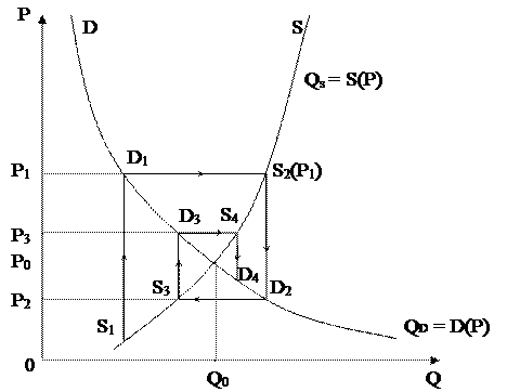 2) на рынке в каждый период t+1 устанавливается равновесная цена Pt+1 , причем эта цена является решением уравнения D(Pt+1 )=St+1 ; 3) потребитель предъявляет спрос, который при цене Pt+1 в каждый момент времени равен предложению St+1 , вследствие чего потребитель приобретает все, что ему предложено. Использование монотонных функций спроса и предложения позволяет построить последовательность цен Pt , где t — номер шага во времени. Действительно, в силу гипотезы (1) товаропроизводитель по значению цены P1 при помощи кривой предложения определяет S2 ; в силу гипотезы (2) на рынке устанавливается цена P2 (находится при помощи кривой спроса); в силу гипотезы (3) весь товар в количестве S2 находит потребителя; в силу гипотезы (1) товаропроизводитель, ориентируясь на цену P2 , определяет объем предложения S3 и т.д. (рис.3). Далее рассмотренный процесс повторяется.